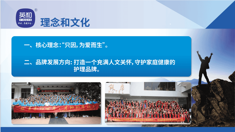 品牌理念:母爱,平凡,却最伟大;在任何一个母亲的眼里,她的宝宝,是世界上最优秀的宝宝;是生命的延续,更是对未来的期许;在母亲的心里,她的爱,是世界上给予宝宝最好的爱,最简单,却最无保留。母爱,是一次次无声的凝望,虽无言,却温情涌动;母爱,是一滴滴甘甜的雨露,虽透明,却爱意无限!——英和,正是为体现伟大母爱而产生的一个知名品牌!